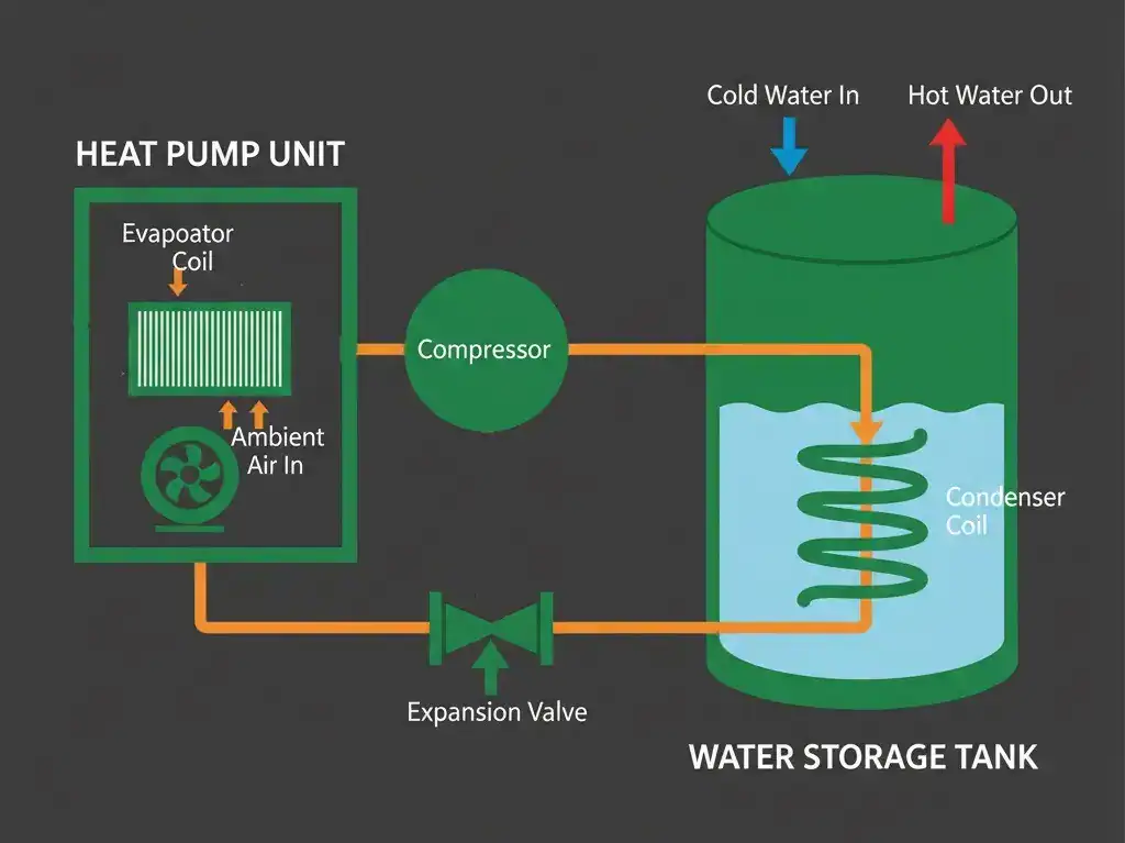 Instead of generating heat directly (like a standard electric element), it pulls warmth from the air around it and transfers that heat into the water tank.