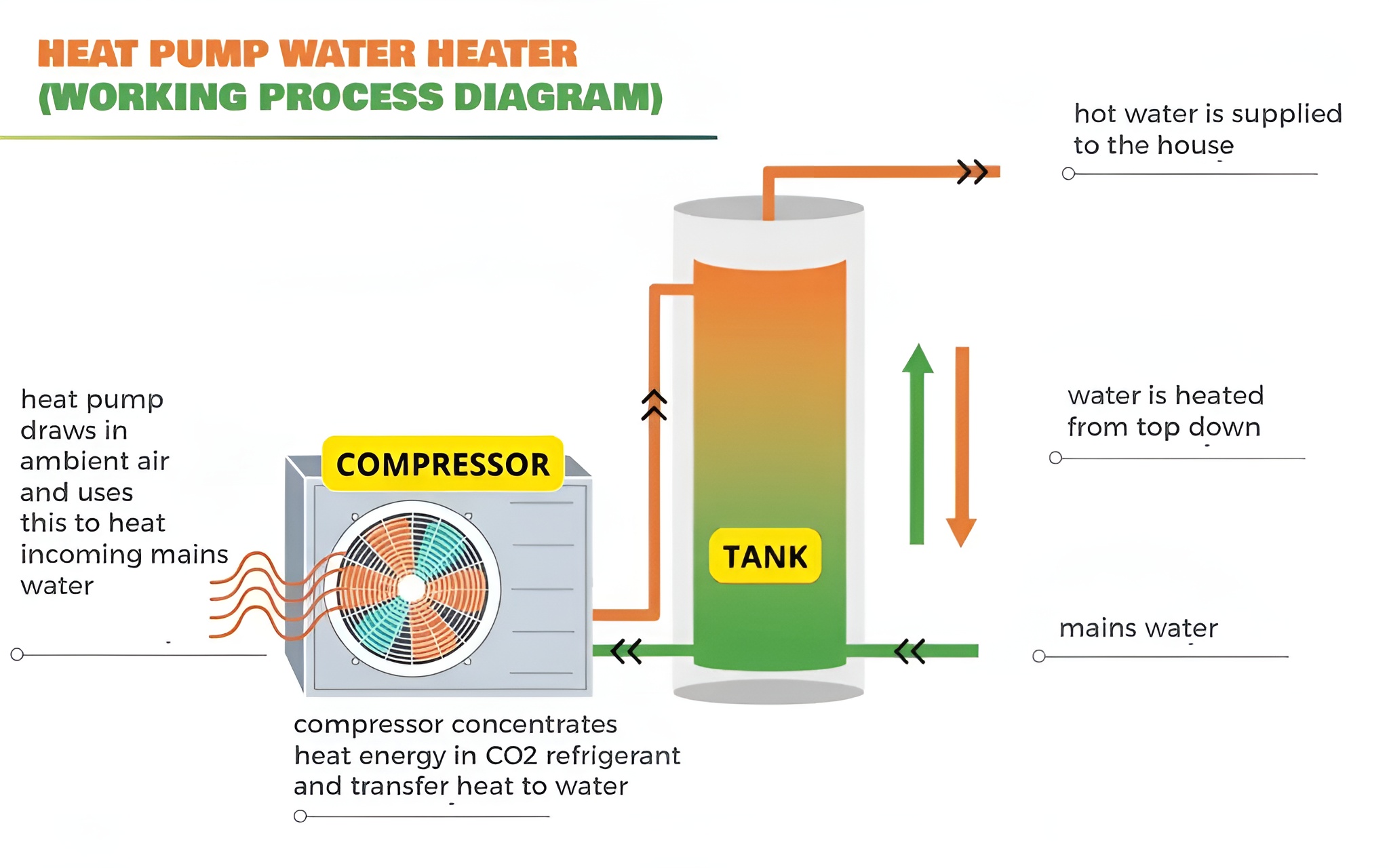Let’s see how the heat pump system components work together to produce hot water efficiently.