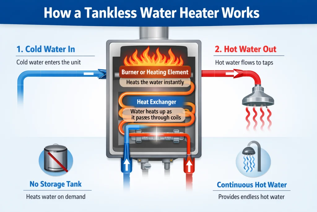 This explains how tankless water heaters heat water without delay. Heat is applied only during flow. Faster flow demands more energy. Slower flow requires less. The system recalculates output continuously.