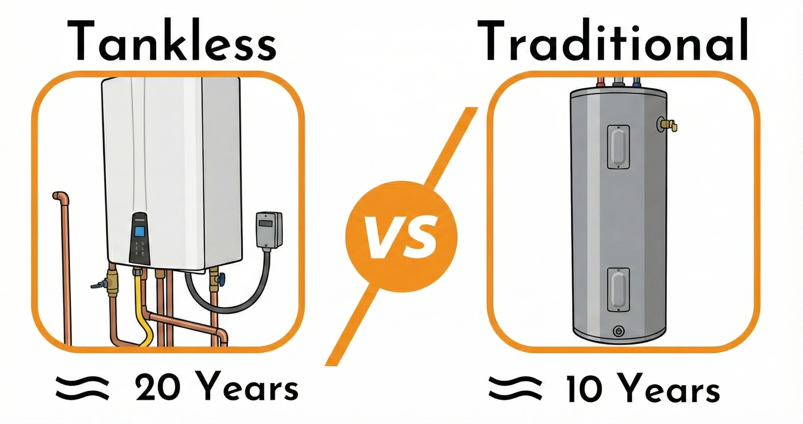 Here’s the simple breakdown of tank vs tankless water heater longevity: