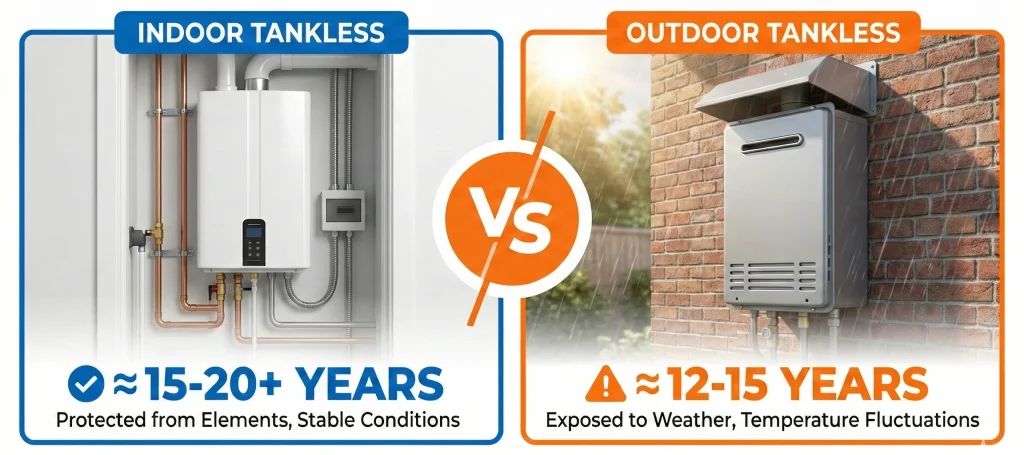 The lifespan of an indoor vs outdoor tankless water heater varies by exposure. Indoor units often last 20+ years. Outdoor units average 12–15 years with protection. Weather, freezing, and airflow affect durability.