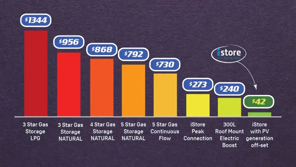 Comparing the iStore to standard electric or gas storage systems, you may be able to reduce your hot water heating operation by half. This translates to up to $1,000 a year in energy costs, and also helps the environment by reducing CO2 emissions by approximately four tonnes.