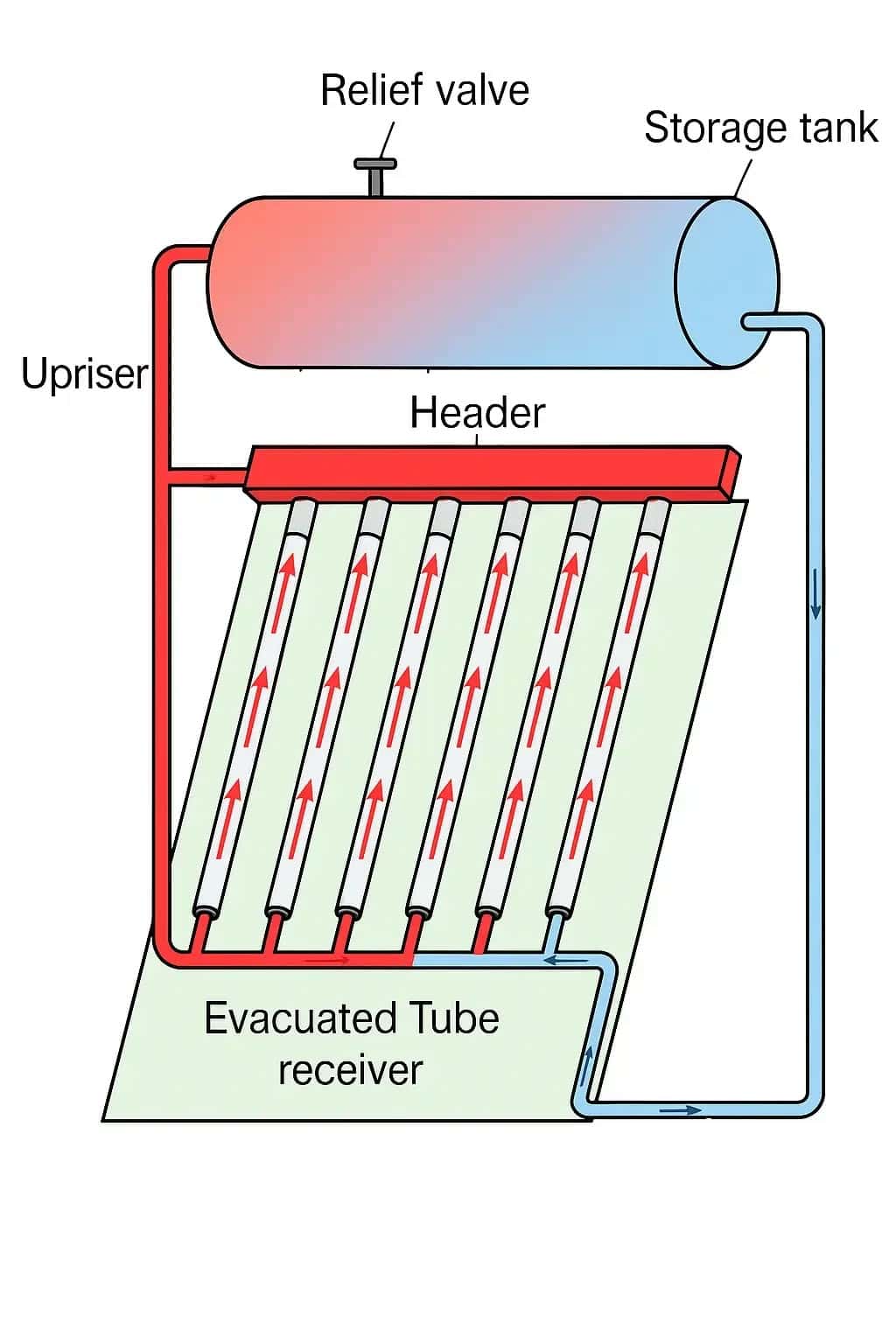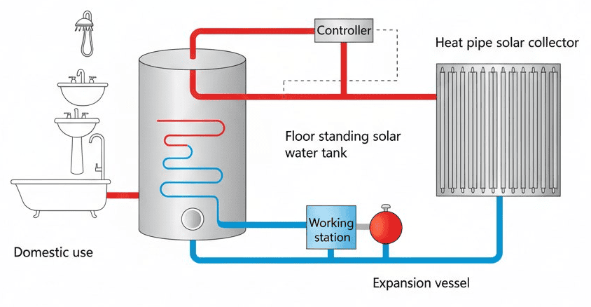 The system utilises natural convection: as sunlight heats the water in the collector, it naturally circulates into the tank without the need for a pump.