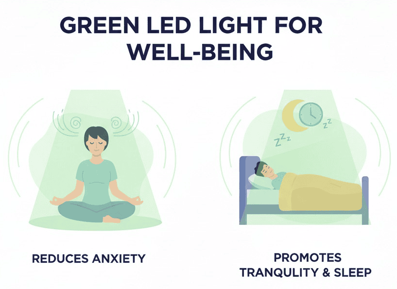 The term light-emitting diode refers to an electronic component that serves that exact purpose: turning electrical current into visible light. LEDs that produce green light are known as “green LEDs.” Glow in the green spectrum is the most effective light colour for calming people down and helping them sleep.