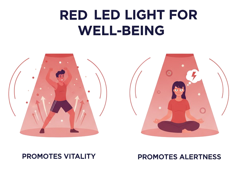 Red LED light stimulates the production of alpha waves in the brain, which is linked to wakefulness and alertness. Red LED lighting also stimulates the adrenal glands, which produce more energy, and also promotes the production of metabolism-regulating hormone cortisol.