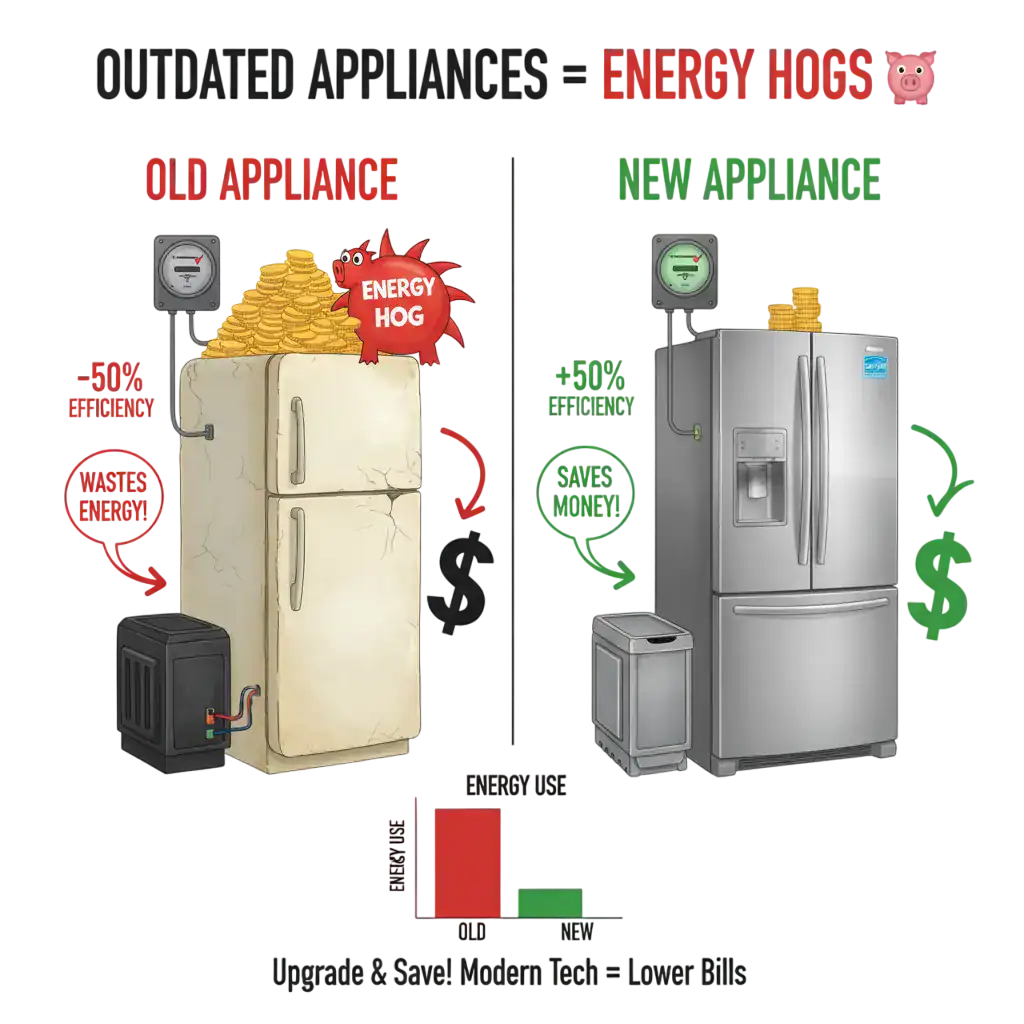 Old appliances were constructed when energy efficiency was not a concern. Compared to new Energy Star-rated ones, they can use twice the energy or even more!